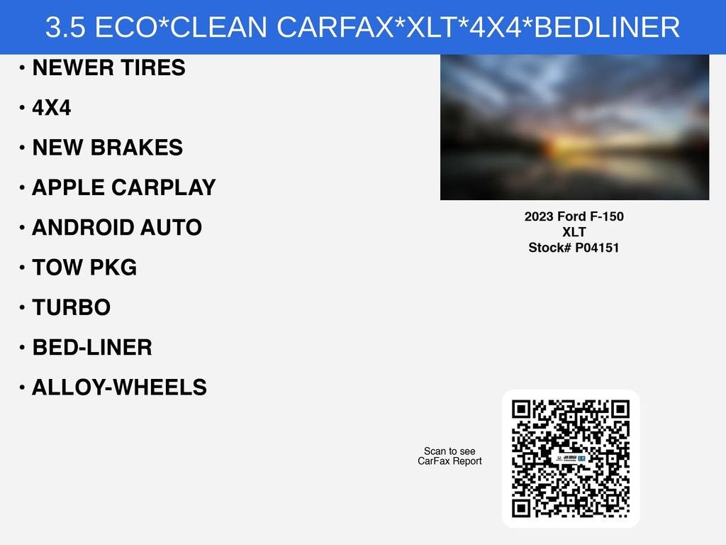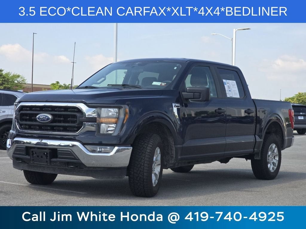 CLEAN CARFAX*3.5 ECO*Recent Arrival! White's Ford of Orrville is pumped up to offer this 2023 Ford F-150 XLT in Blue Metallic with Black W/Medium Dark Slate Cloth. This F-150 is very well equipped with 18 Silver Painted Aluminum Wheels, 6 Speakers, Air Conditioning, AM/FM radio, Panic alarm, Power steering, Power windows, Radio data system, Radio: AM/FM Stereo w/6 Speakers, Speed control, SYNC 4, and Variably intermittent wipers.See what a difference a short drive can make. Call us at 330-682-2040.