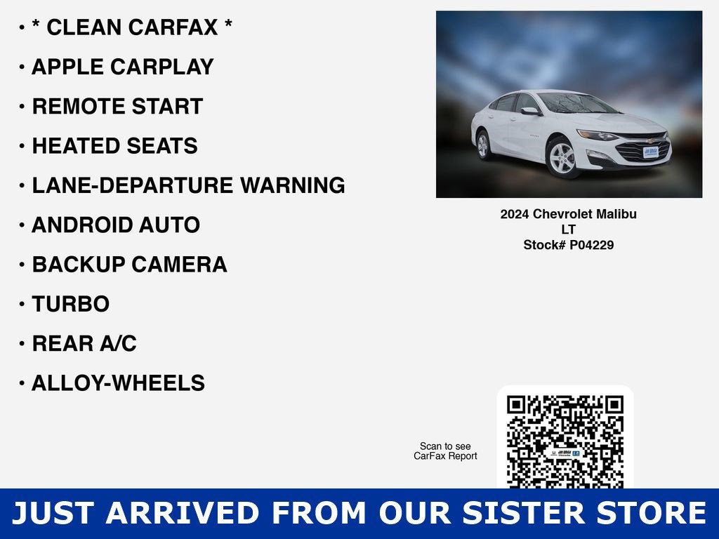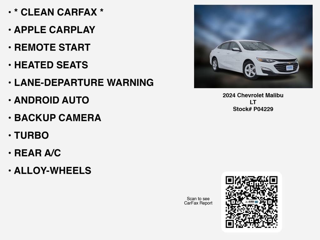 Recent Arrival! White's Ford of Orrville is very proud to offer this 2024 Chevrolet Malibu LT in Summit White with Jet Black w/Premium Cloth Seat Trim. This Malibu is very well equipped with Preferred Equipment Group 1LT, 16 Aluminum Wheels, 6-Speaker Audio System Feature, 8-Way Power Driver Seat Adjuster, Air Conditioning, AM/FM radio: SiriusXM, Automatic temperature control, Heated Driver & Front Passenger Seats, Power driver seat, Power steering, Power windows, Premium audio system: Chevrolet Infotainment 3 Plus, Radio data system, Remote keyless entry, and Steering wheel mounted audio controls.28/36 City/Highway MPGSee what a difference a short drive can make. Call us at 330-682-2040.